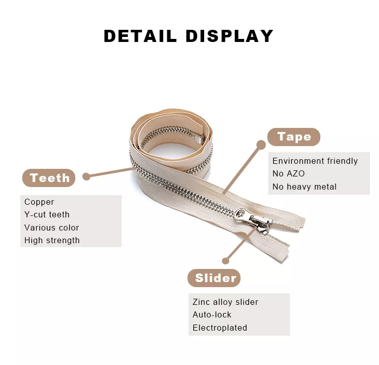 Der umweltfreundliche TRC-Reißverschluss aus recyceltem Metall wird hauptsächlich aus recycelbaren Legierungen und Polyesterfasern hergestellt und vereint hervorragende Haltbarkeit, Geschmeidigkeit und Umweltverantwortung. Das Produkt wird strikt nach internationalen Umweltstandards hergestellt, wodurch der Ressourcenverbrauch und der ökologische Fußabdruck deutlich reduziert werden, was es zu einem zuverlässigen Garant für den Aufbau einer grünen Lieferkette und die Umsetzung einer nachhaltigen Entwicklungsstrategie macht.