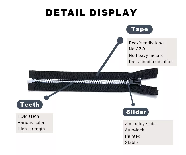 TRC-Reißverschlüsse aus recyceltem Kunststoff bestehen aus hochfesten, geformten Kunststoffzähnen und bieten eine hervorragende Beständigkeit gegen Verformung, Abrieb und wiederholten Gebrauch. Das leichte und langlebige Polyesterband verbessert außerdem die Flexibilität und den Komfort des Reißverschlusses und macht ihn zur idealen Wahl für Bekleidung, Outdoor-Ausrüstung, Gepäck und andere Anwendungen, bei denen Leistung und Haltbarkeit entscheidend sind.