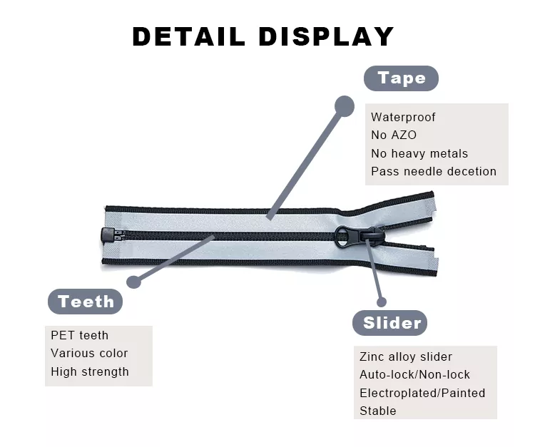 Der wasserdichte Nylon-Reißverschluss von TRC bietet drei Oberflächenausführungen: matt, glänzend und halbmatt. Unter diesen wird am häufigsten die matte (mattierte) Oberfläche verwendet, gefolgt von der halbmatten Oberfläche. Dieses Produkt funktioniert reibungslos, ist sowohl verschleißfest als auch langlebig und vereint Schutzfunktion mit ästhetischem Erscheinungsbild.